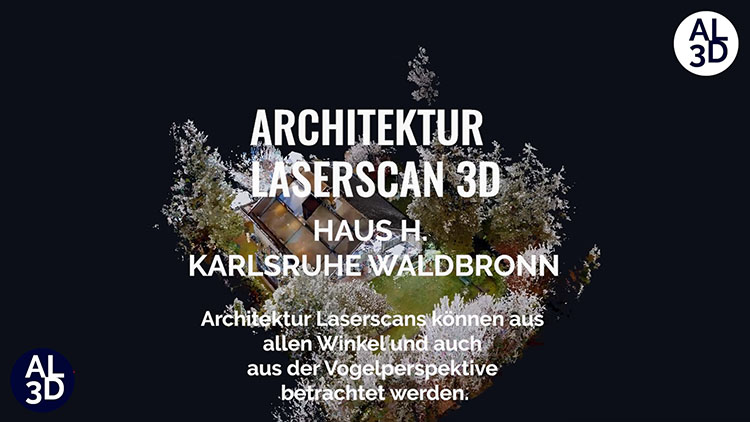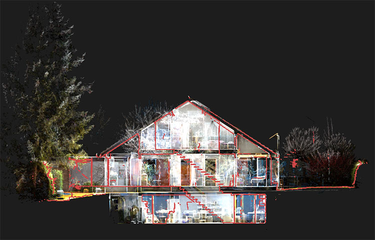 Die Punktwolke Haus H. ist die exakte Kopie des Hauses. Dabei wird Laserscan-Technologie verwendet, um detaillierte räumliche Daten des Innen- und Außenbereichs des Hauses zu erfassen.